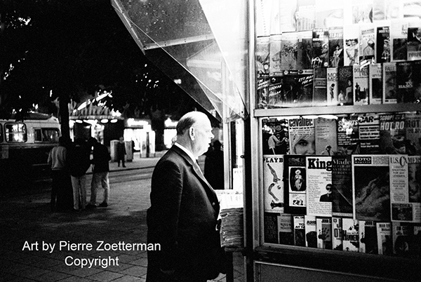 Tidningskiosk på Stureplan i Stockholm en varm sommarkväll 1966. Ute på promenad med kameran medan jag väntade på att min flickvän skulle sluta jobbet tvärs över gatan. Mannen var så kusligt lik